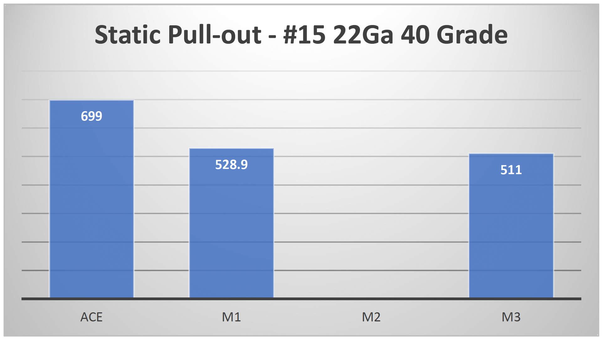 Utilizing Third Party testing - Ace Screws had a pull-out value in 22Ga 40 Grade steel deck of 699 lbf while the competition pulled at 529 lbf and 511 lbf.